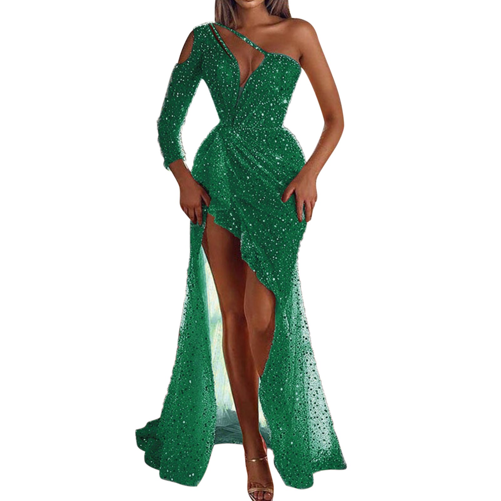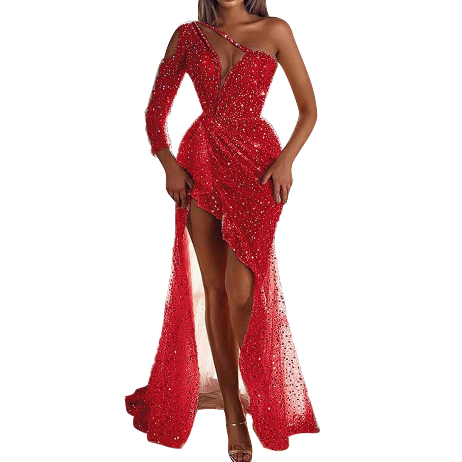 Womens Off Shoulder Solid Color Glitter Irregular Hem Dress Party Dress